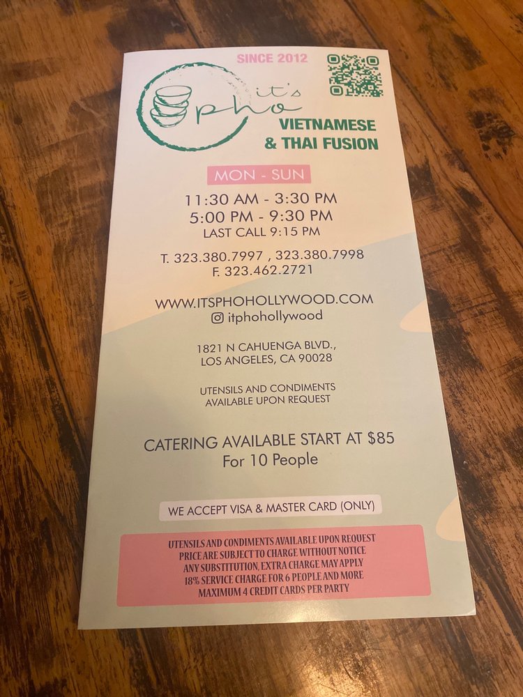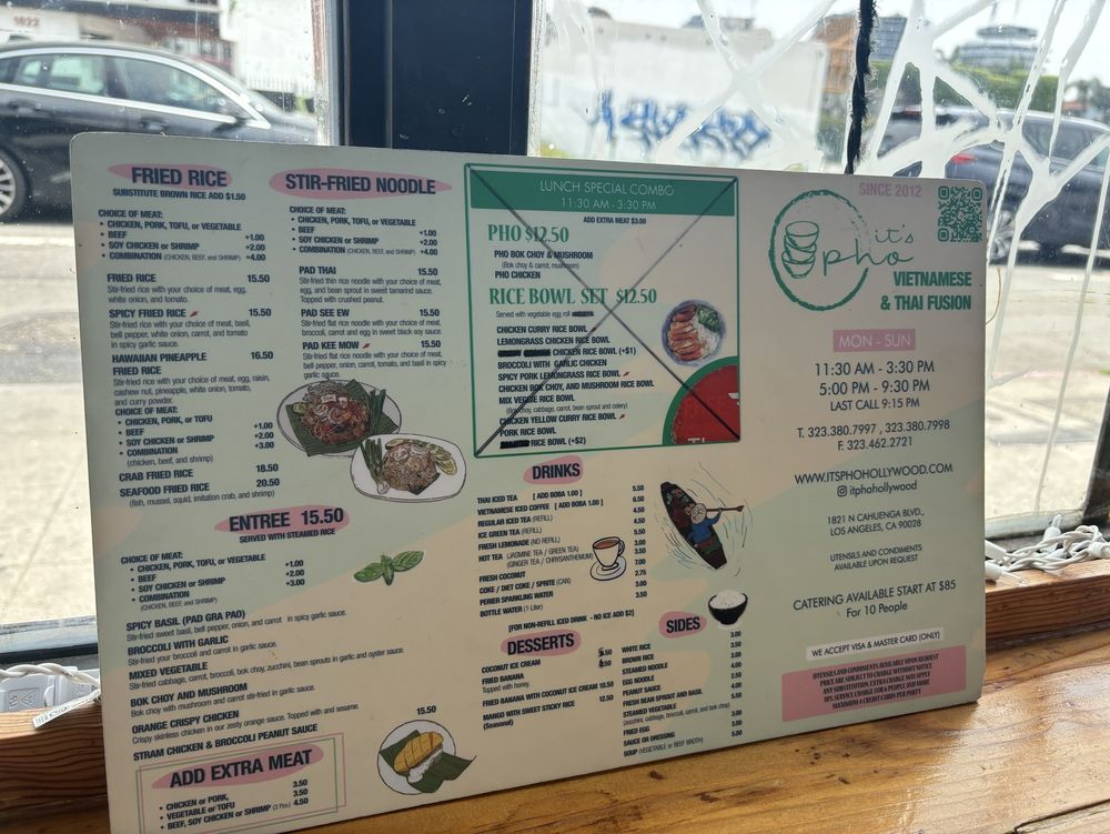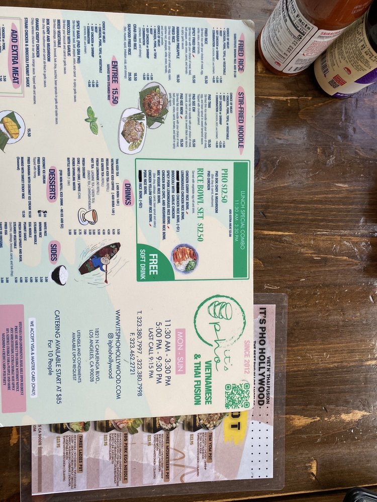 Introducing the menu at It's Pho Hollywood, located in Los Angeles, offers a variety of options for both meat lovers and vegetarians. Their Soup or Rice Bowl Special features delicious choices like Pho Chicken, Stew Beef, Tofu, and more. Appetizers like Garlic noodles, Vegetables Egg Roll, and Fresh rolls with tofu are also crowd favorites. Customers rave about the authentic Thai cuisine, generous portions, and friendly service. The ambiance is described as soothing, making it a perfect spot for a relaxing meal. While some found the pho bowls slightly small for the price, others praised the fresh ingredients and flavorful broth. Whether you're a pho enthusiast or looking for a cozy dining experience, It's Pho Hollywood is a must-visit gem in California.